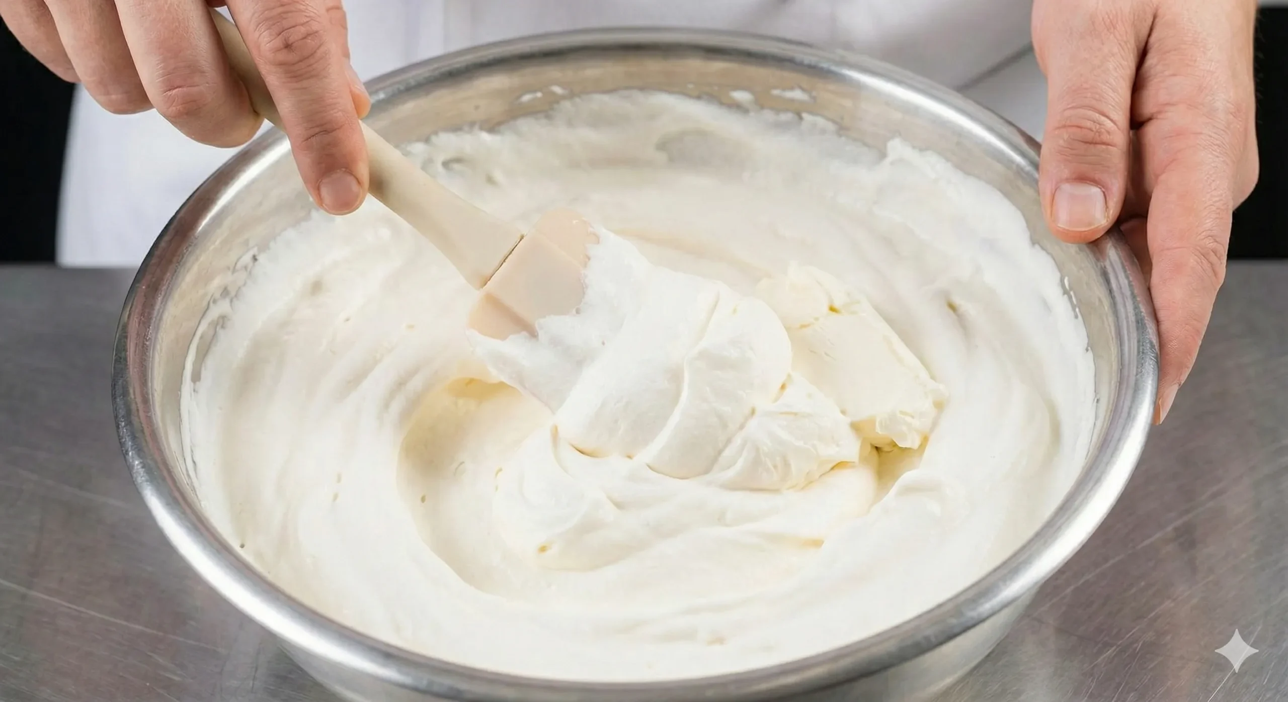 مرحله دوم: فولد کردن پنیر خامه‌ای در این تصویر، پنیر خامه‌ای که از قبل باز شده، با لیسک به آرامی در خامه فولد می‌شود. این روش از شل شدن خامه جلوگیری می‌کند و بافتی لطیف و پنیری ایجاد می‌کند.