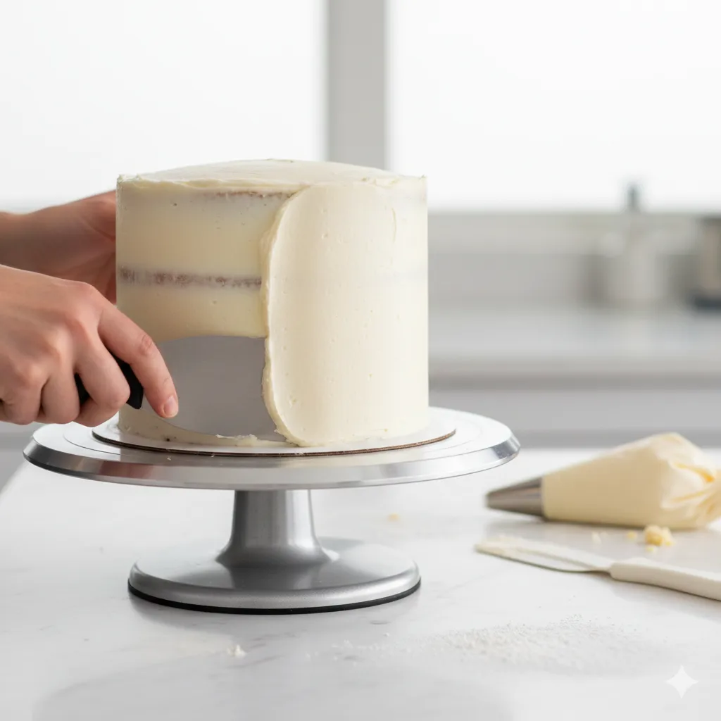 بدون پایه گردون، خامهکشی صاف تقریباً غیرممکن است. شما نباید دور کیک بچرخید؛ کیک باید دور شما بچرخد!